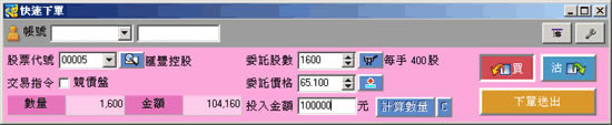 可直接輸入投資金額,按計算數量按鈕 後,系統會以委託價格計算可委託股數,並將計算出來的結果直接帶入委託股數輸入欄位中,並揭示於數量與金額的表格中。